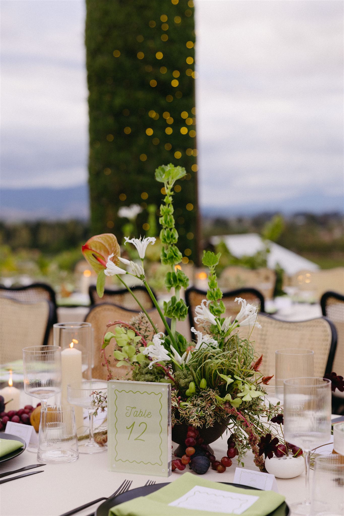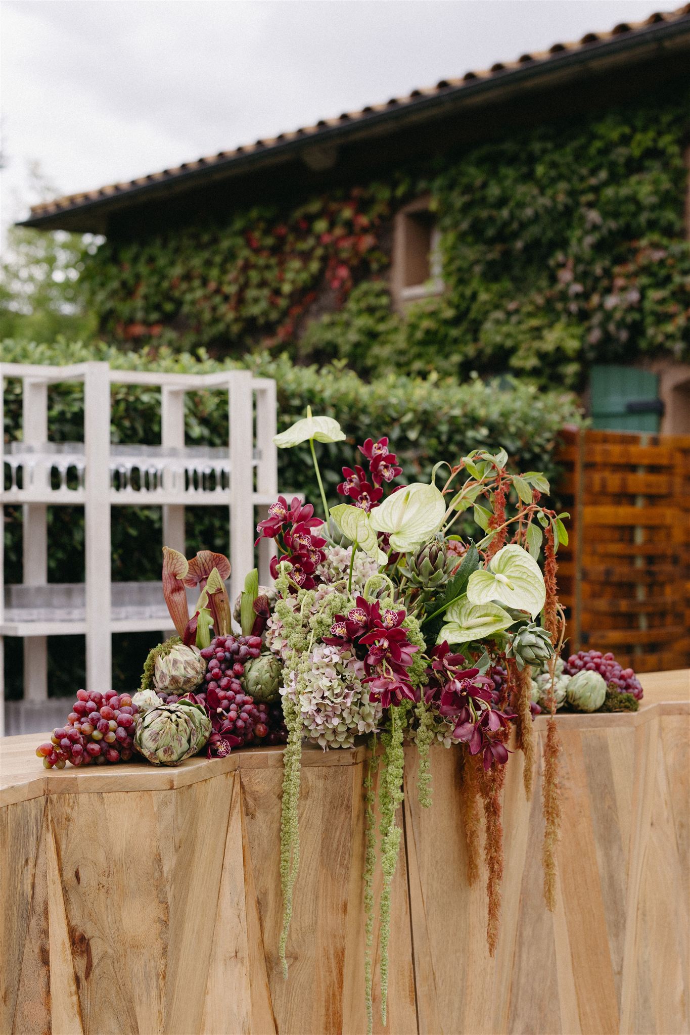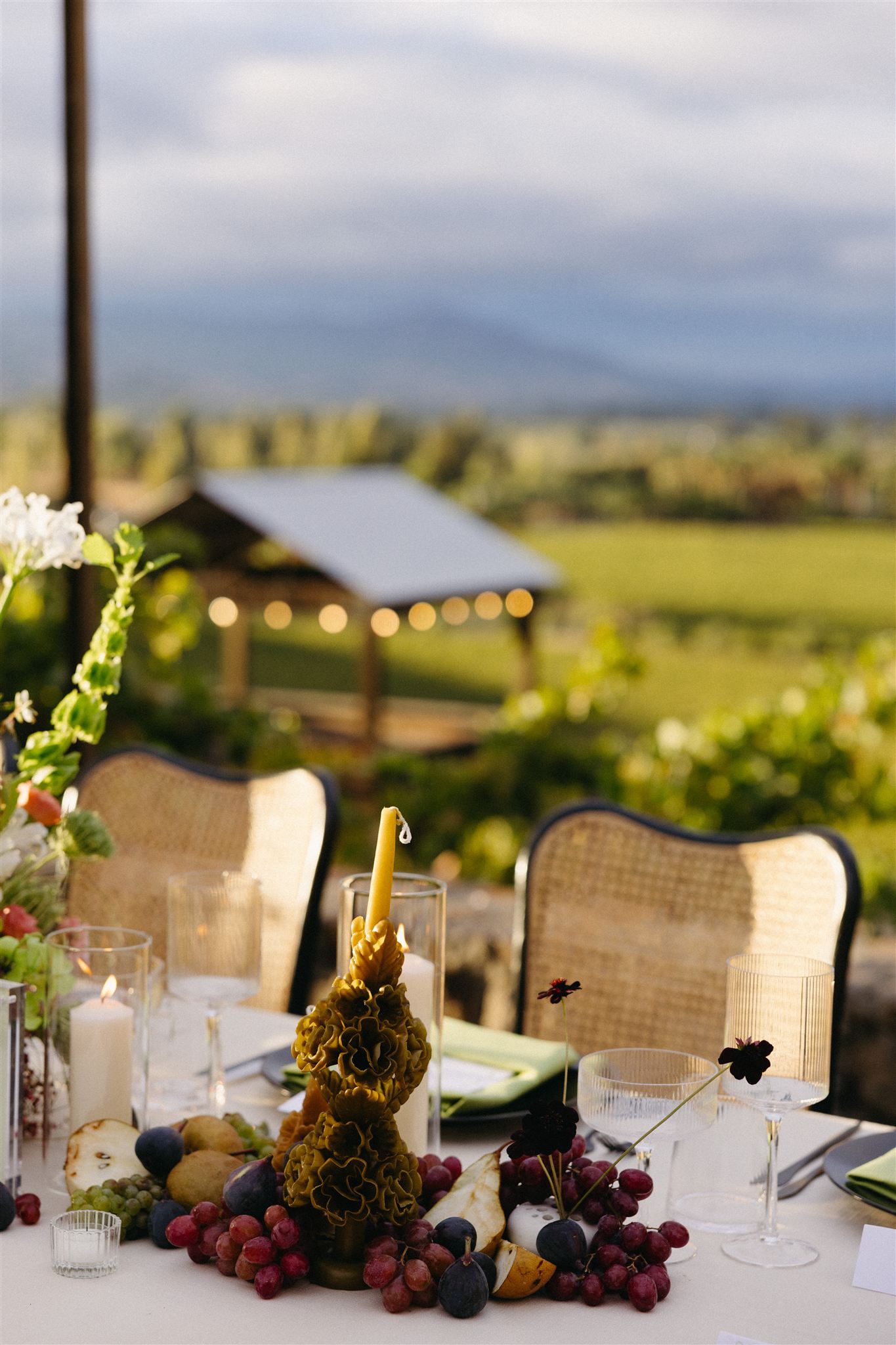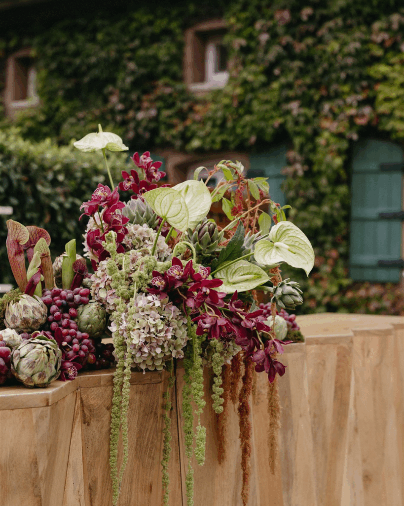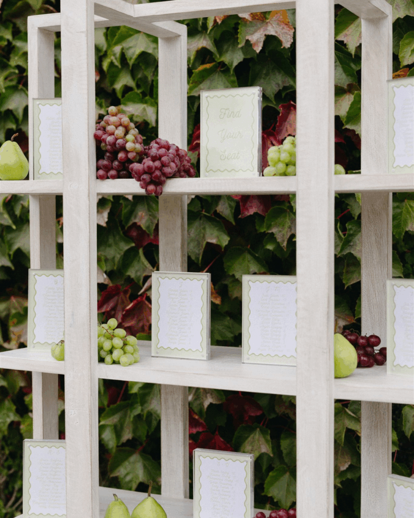 Soft whites, greenery, and subtle pops of color created a refined yet organic look that complemented the vineyard setting. The florals featured grounded installations that blended seamlessly with the environment, seasonal blooms in soft, romantic tones and organic fruit and vegetable arrangements that felt gathered rather than structured.
