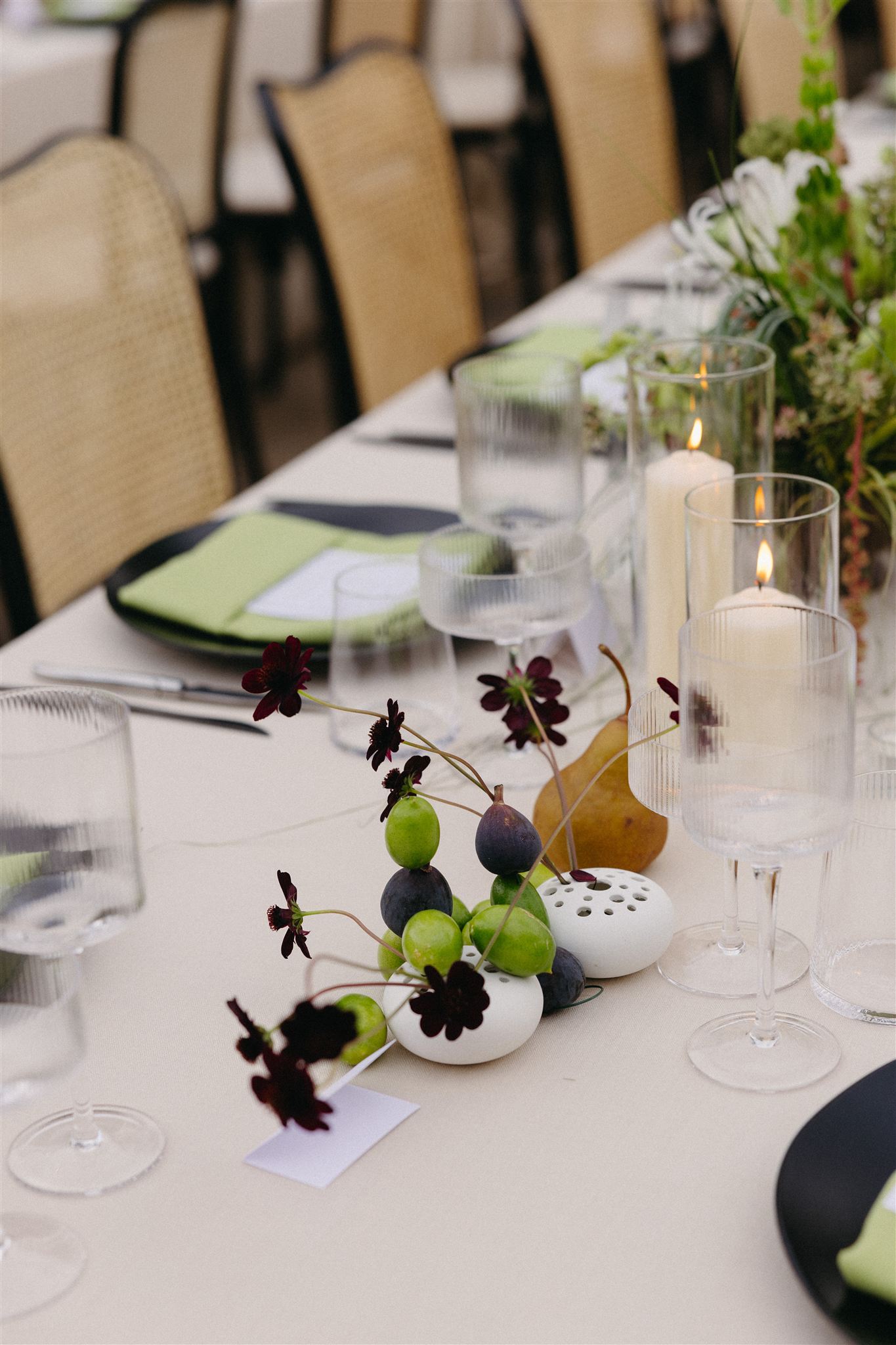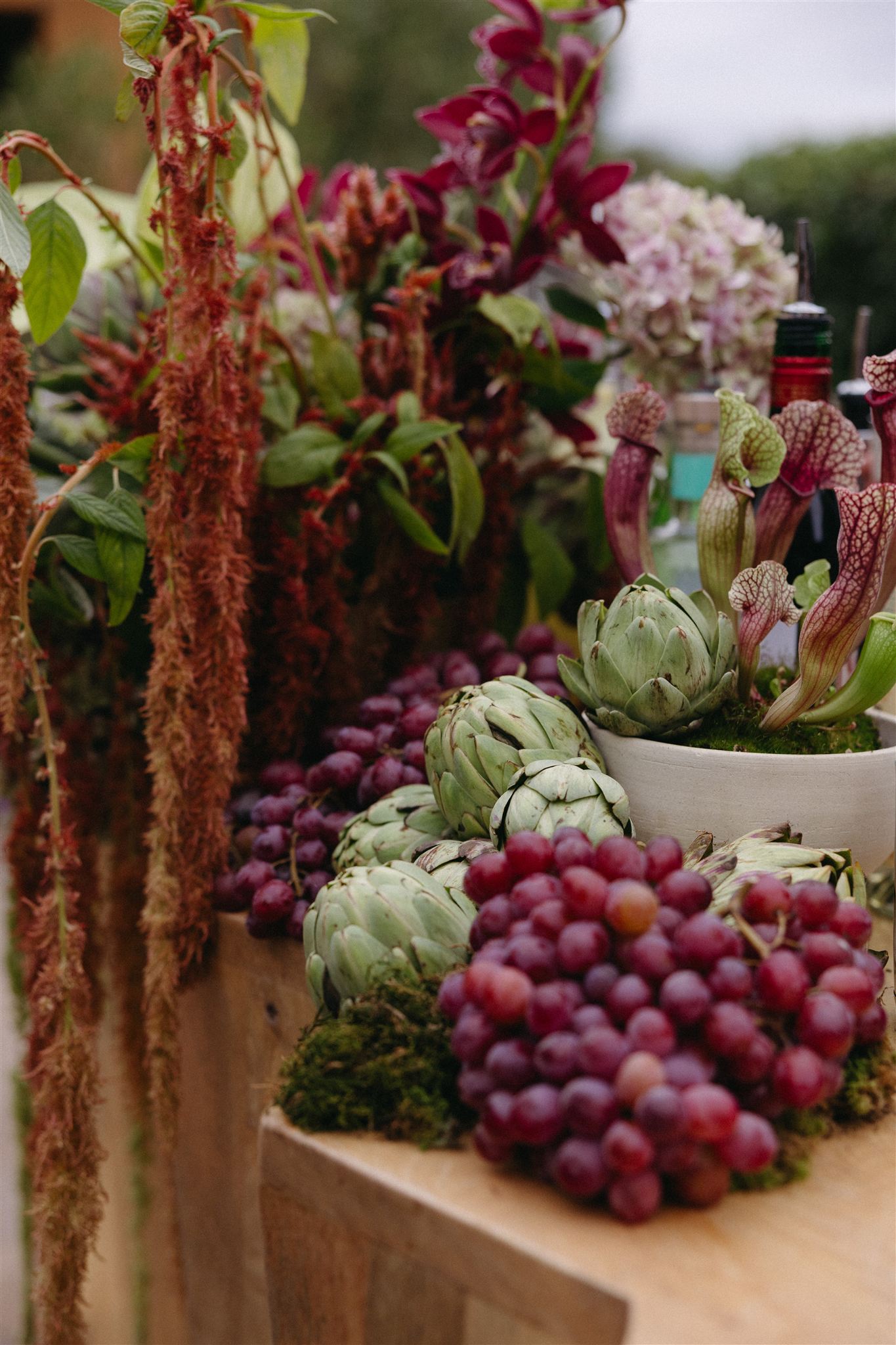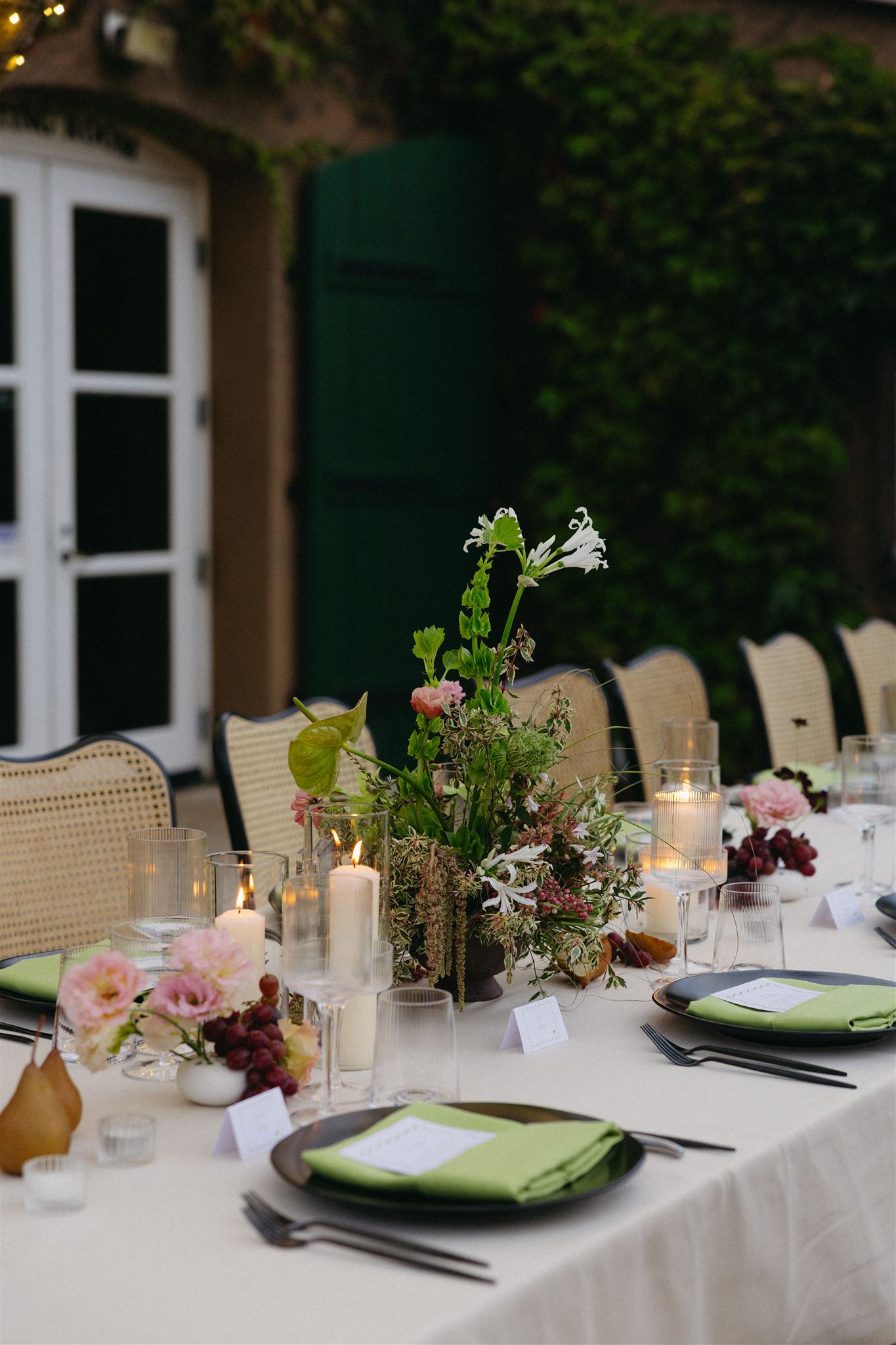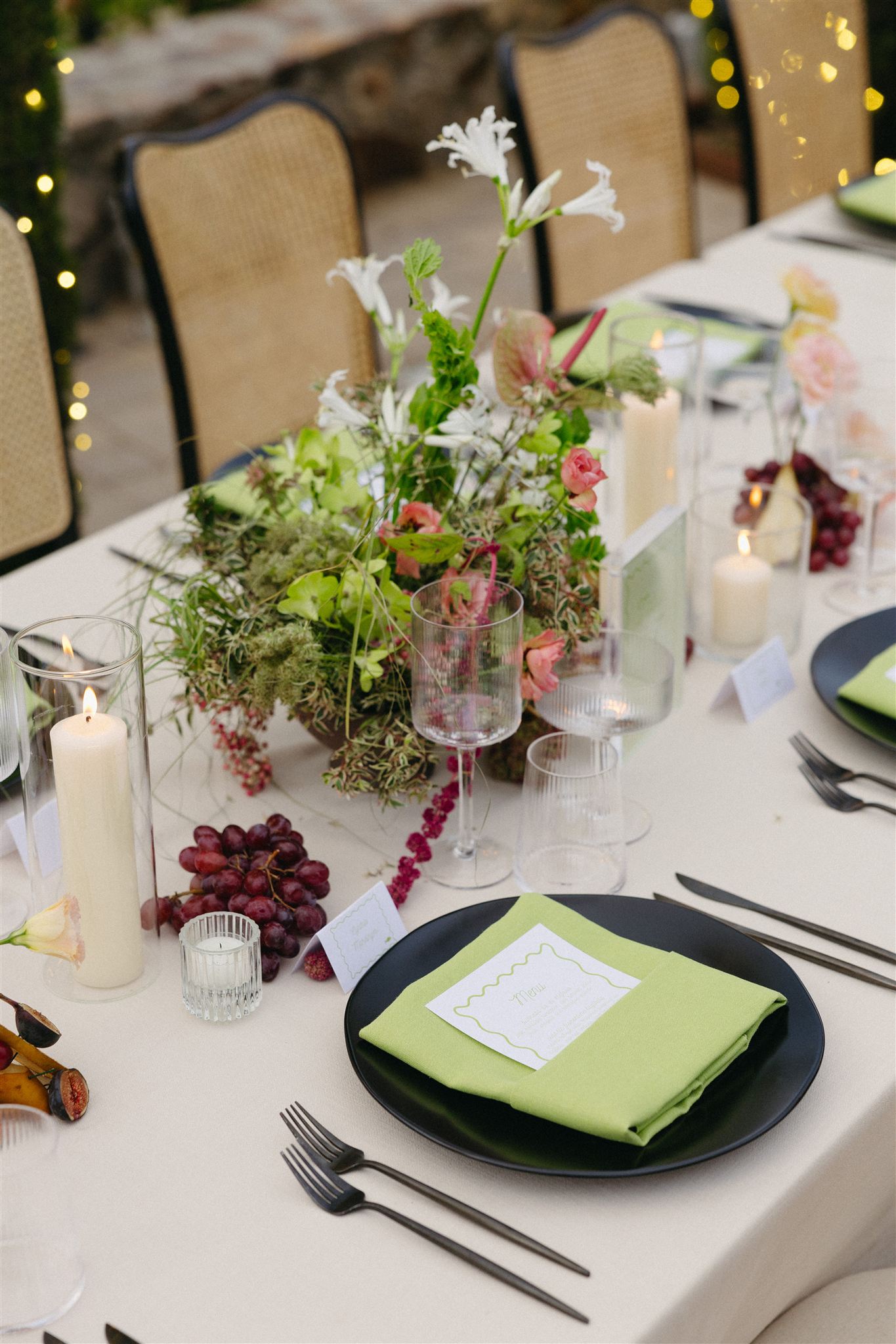 Soft whites, greenery, and subtle pops of color created a refined yet organic look that complemented the vineyard setting. The florals featured grounded installations that blended seamlessly with the environment, seasonal blooms in soft, romantic tones and organic fruit and vegetable arrangements that felt gathered rather than structured.