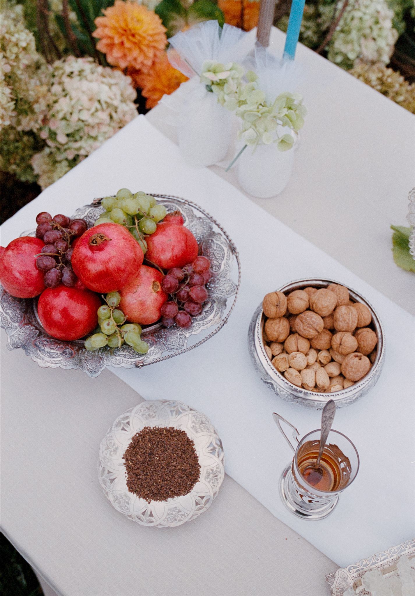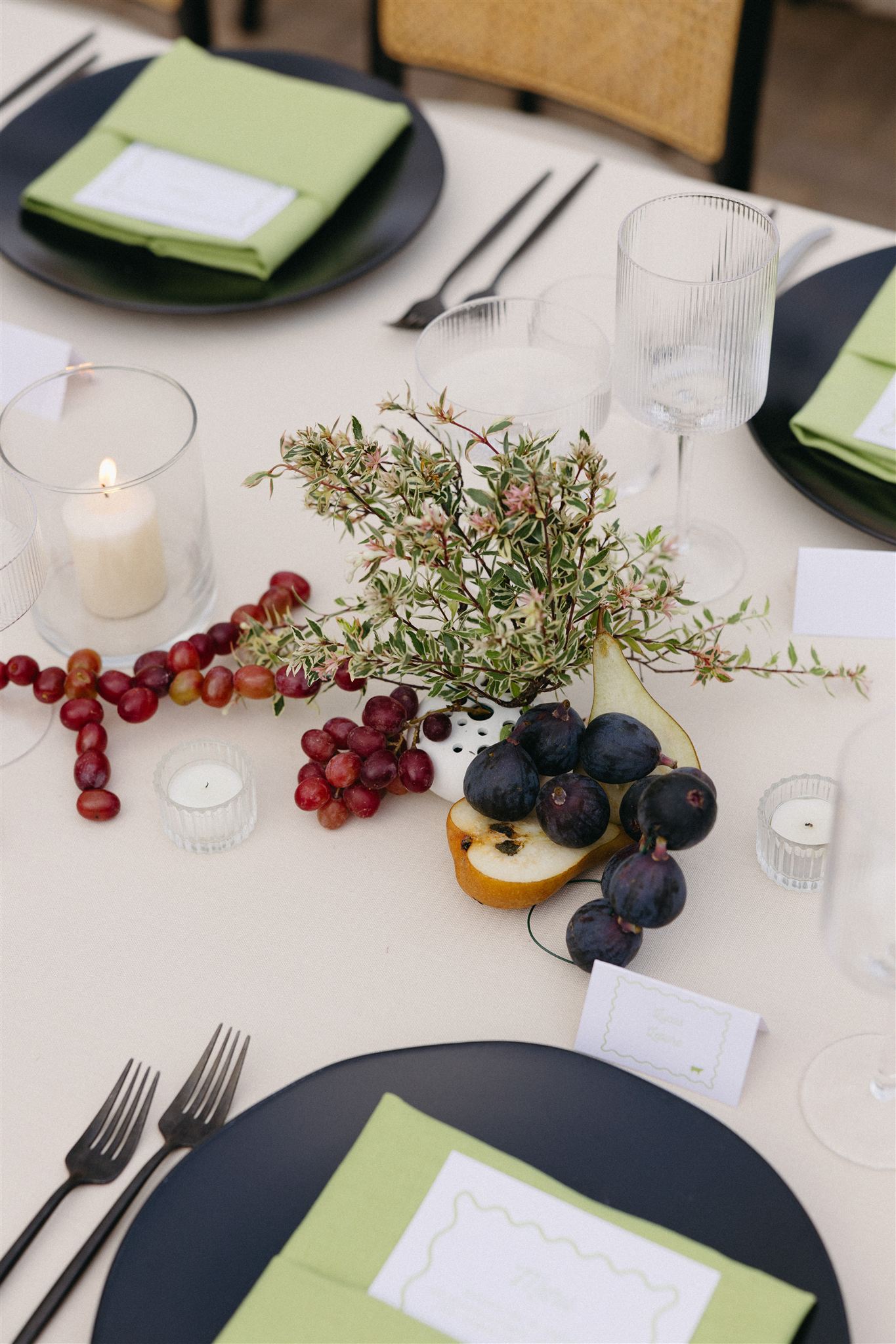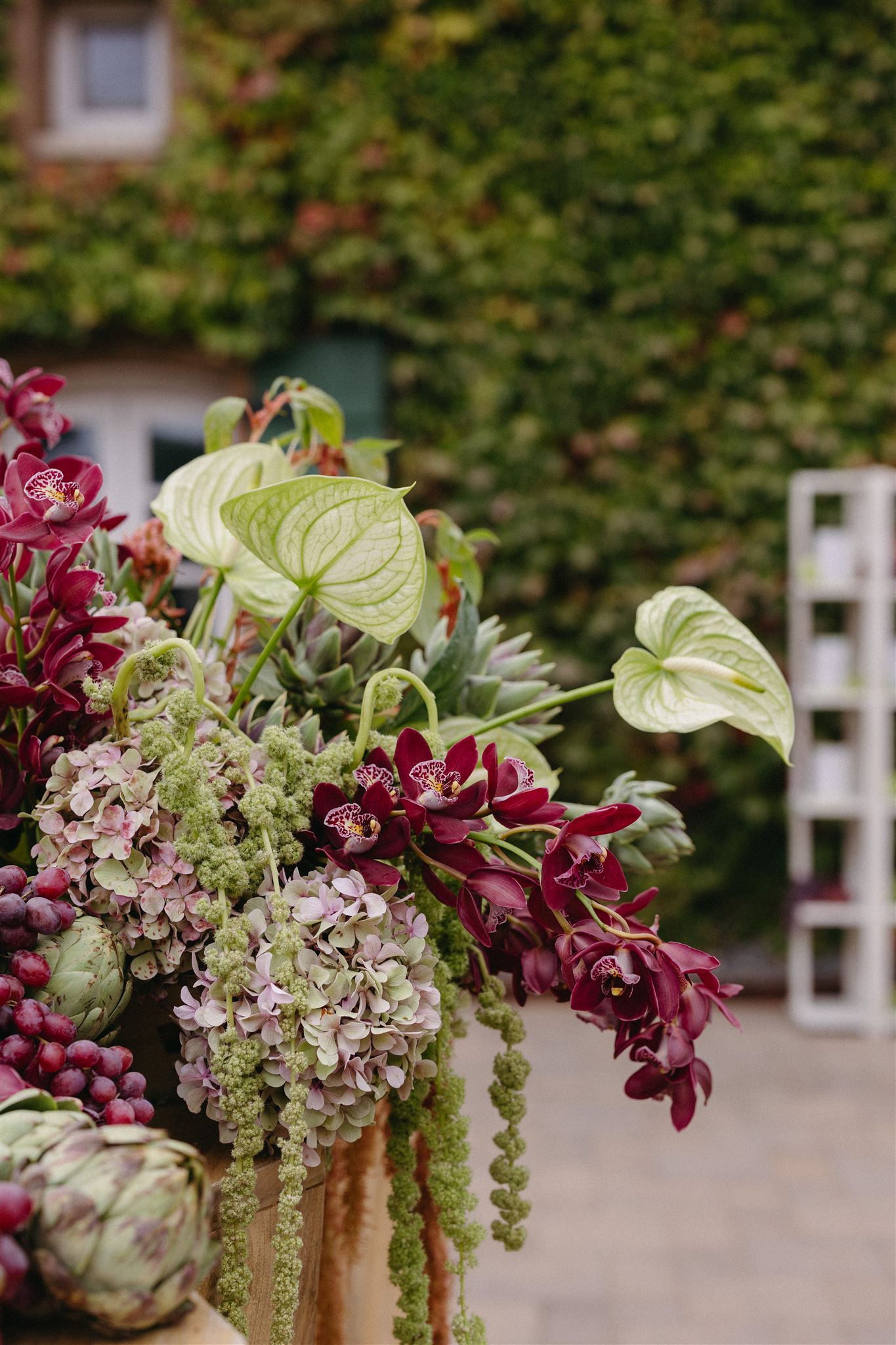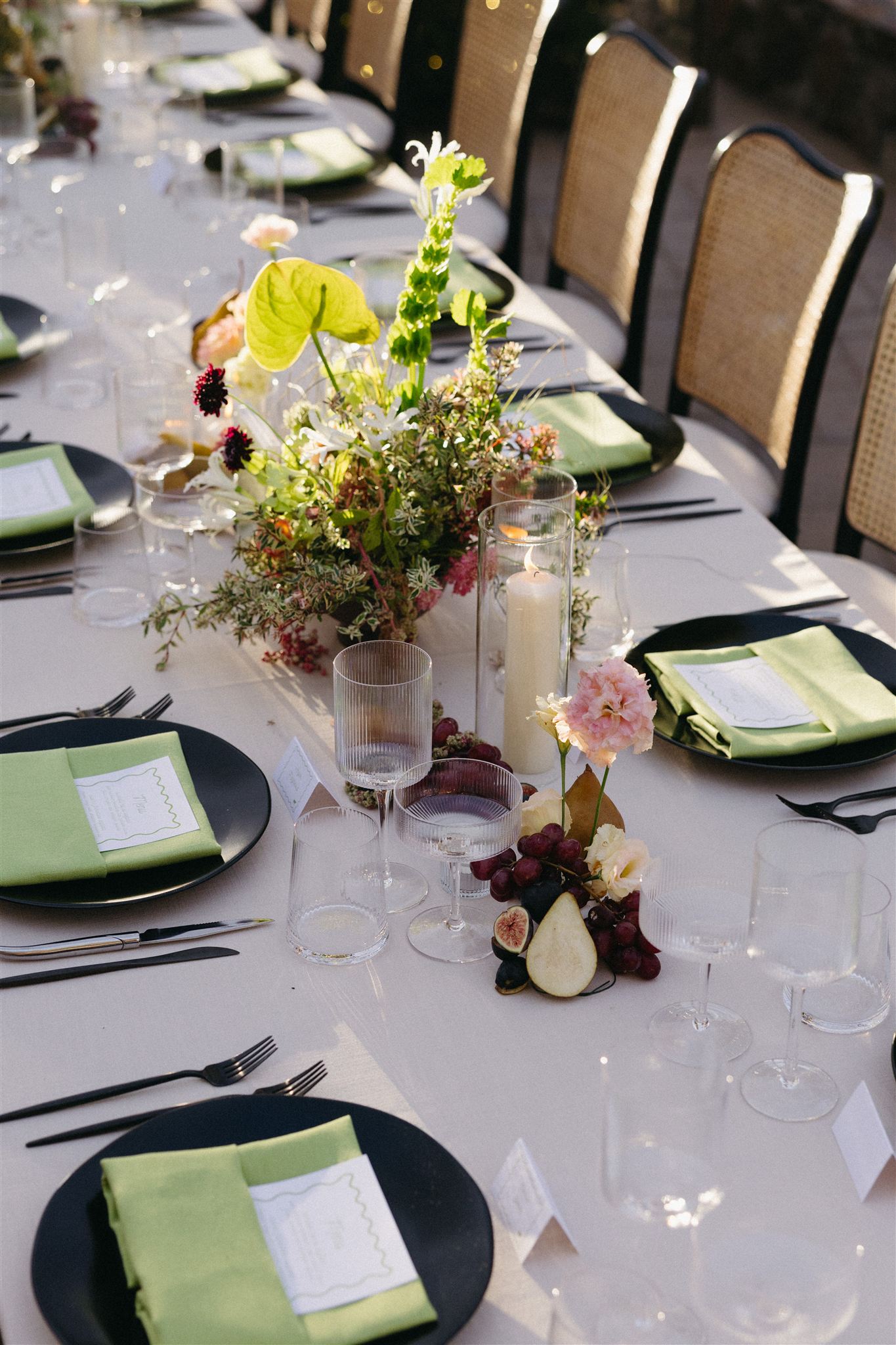 Soft whites, greenery, and subtle pops of color created a refined yet organic look that complemented the vineyard setting. The florals featured grounded installations that blended seamlessly with the environment, seasonal blooms in soft, romantic tones and organic fruit and vegetable arrangements that felt gathered rather than structured.